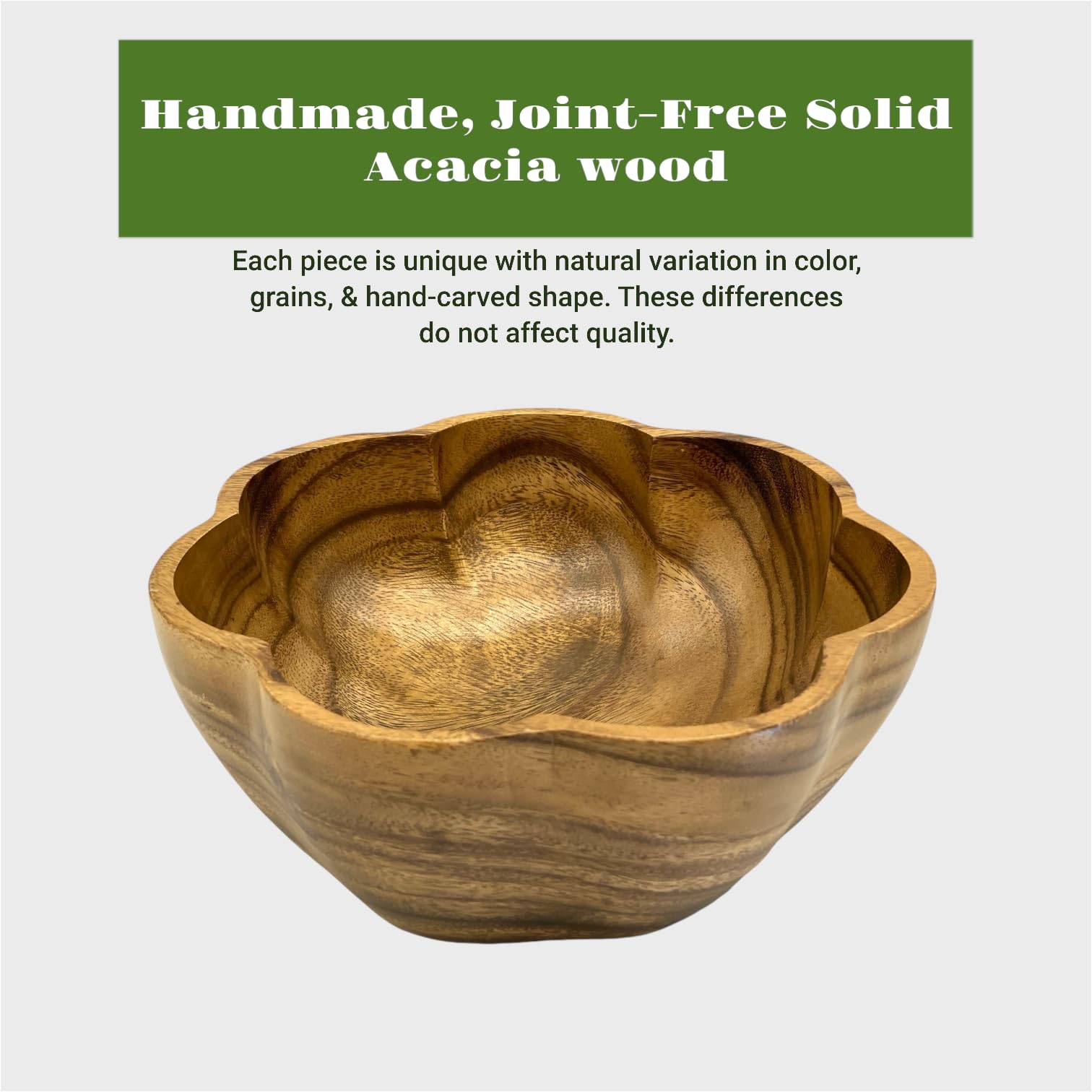 - DURABILITY AND CARE: Handcrafted from 1 solid piece of Acacia Wood with no laminated wood joints, these bowls are built to last. To maintain their beauty, handwashing and hand drying are recommended, and occasional oiling with food-grade mineral oil is recommended.