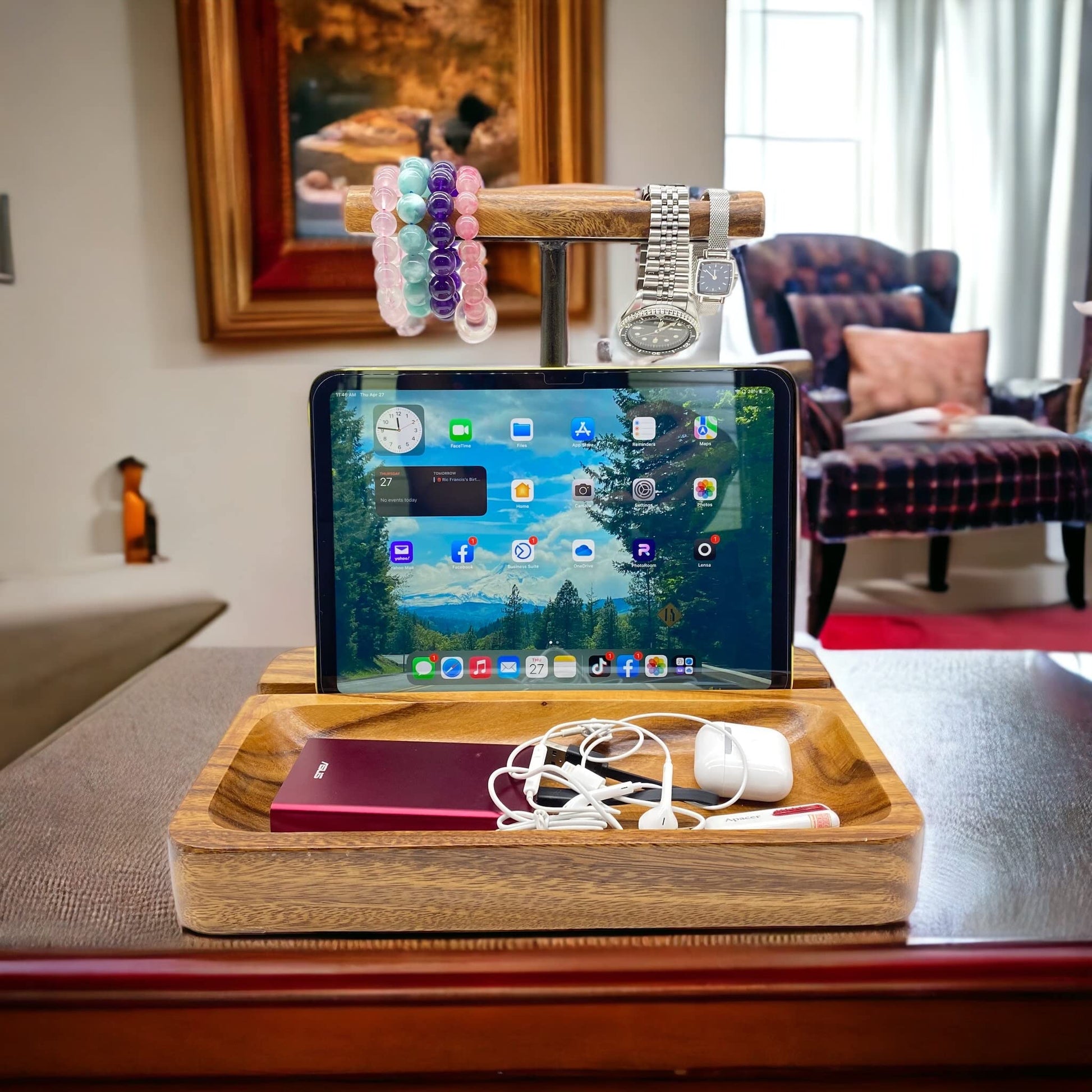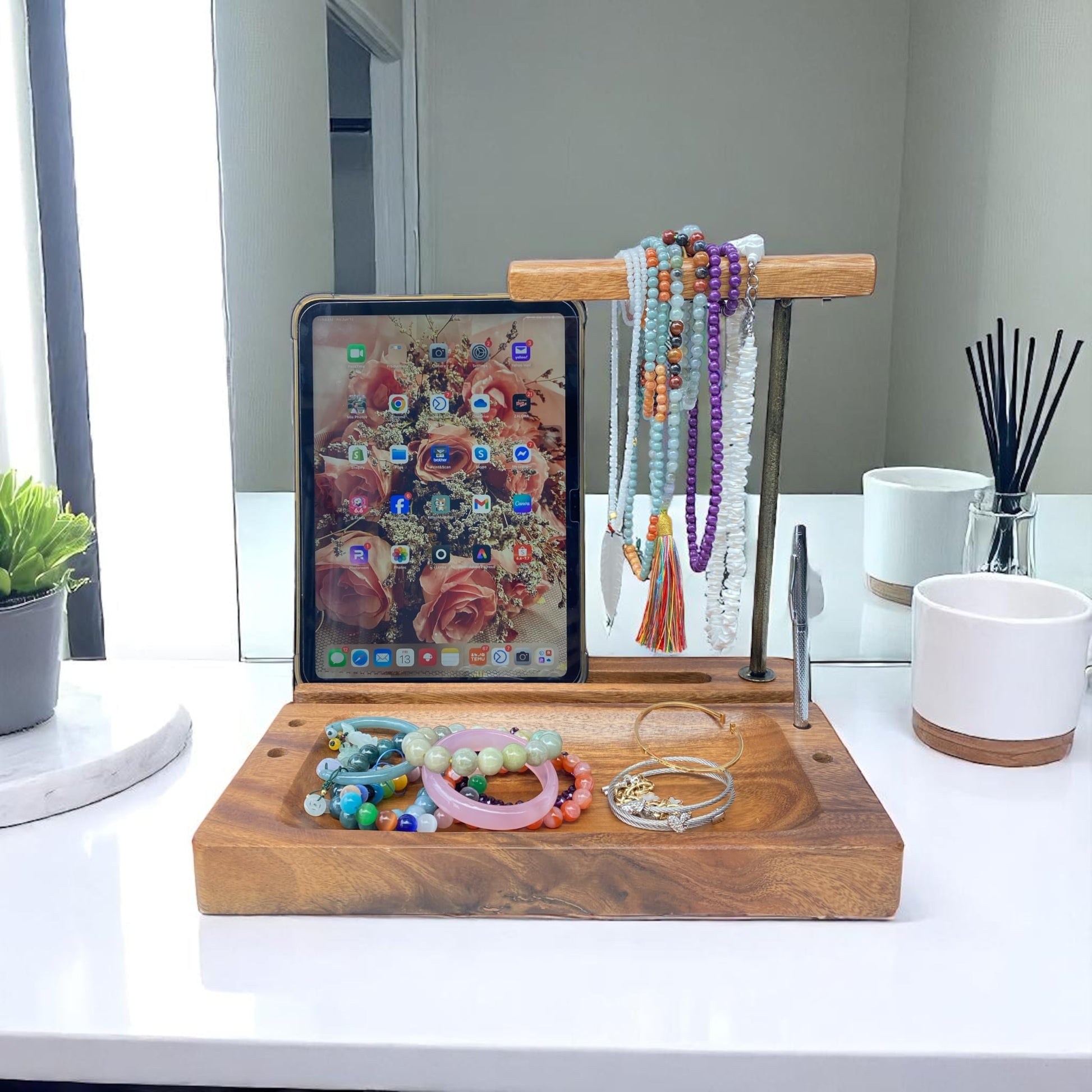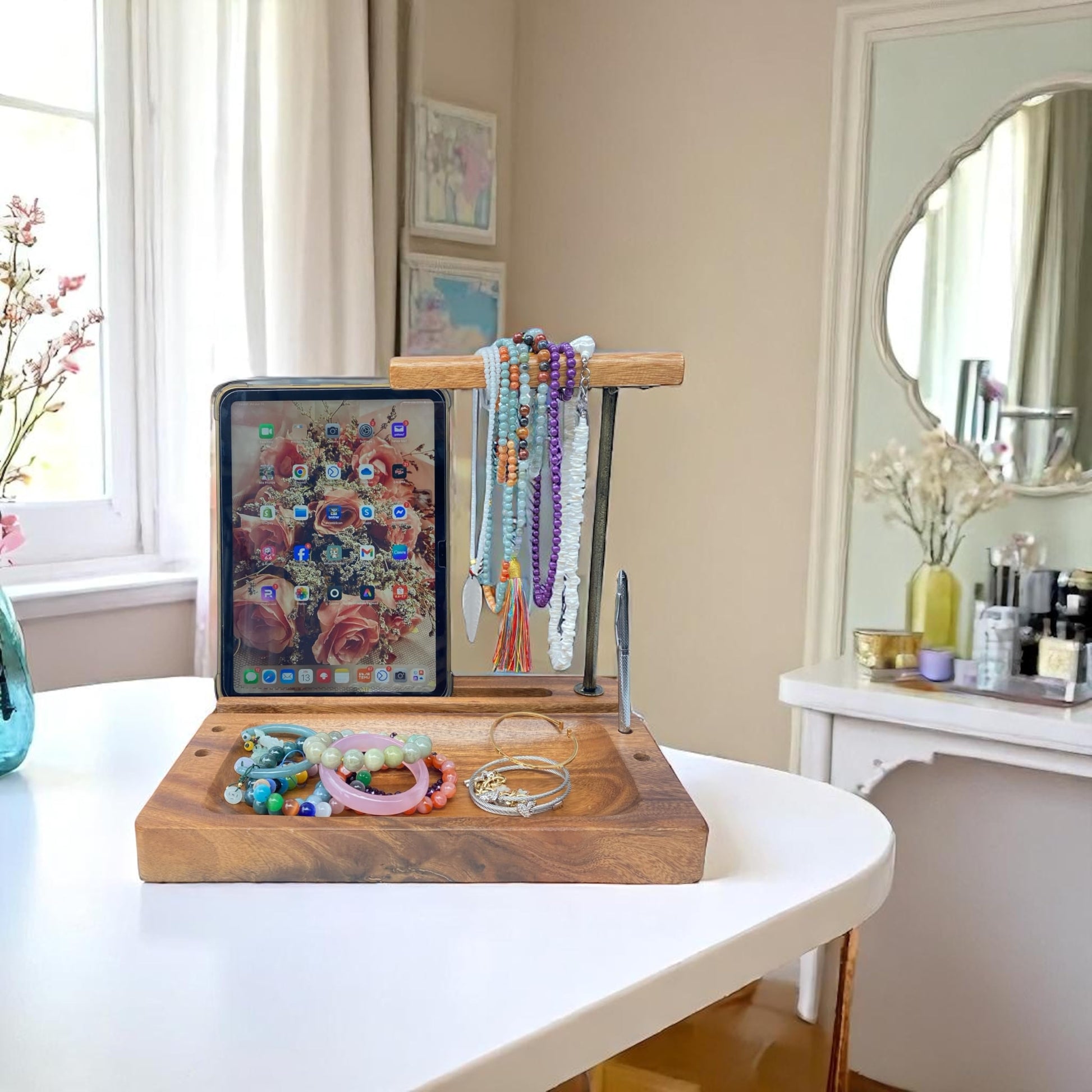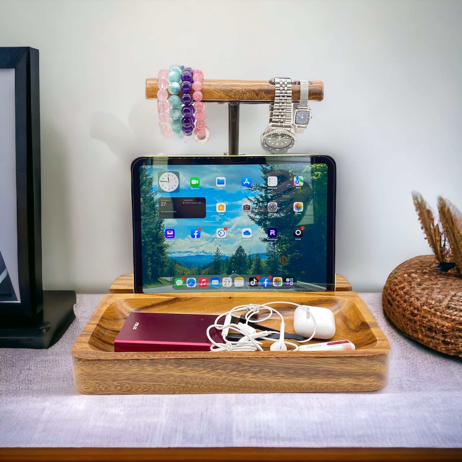 - Headphone and Mobile Phone Stand: This stand is designed to hold both headphones and mobile phones simultaneously. The solid Acacia wood construction provides a sturdy and stylish solution for keeping your headsets and cell phones organized and accessible.