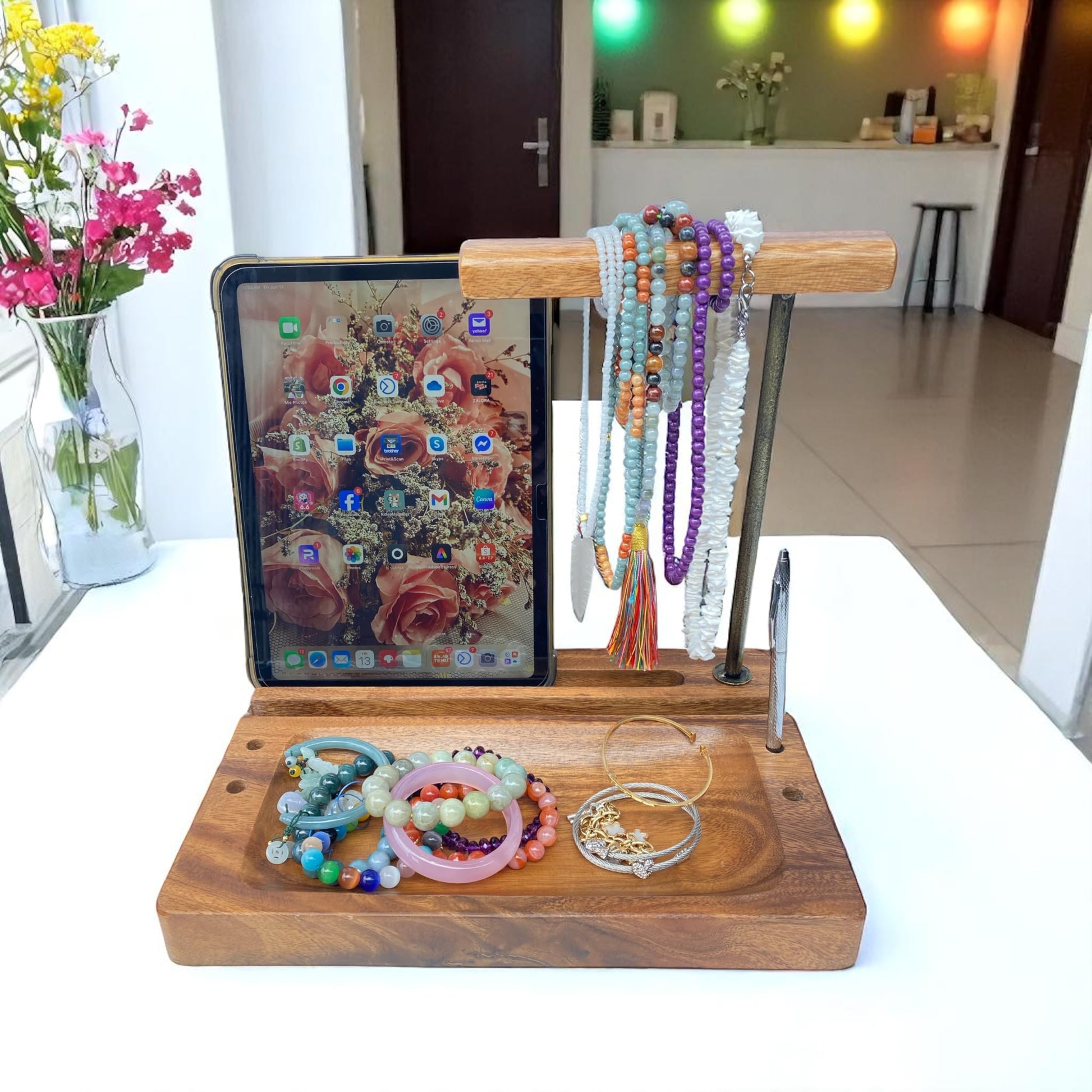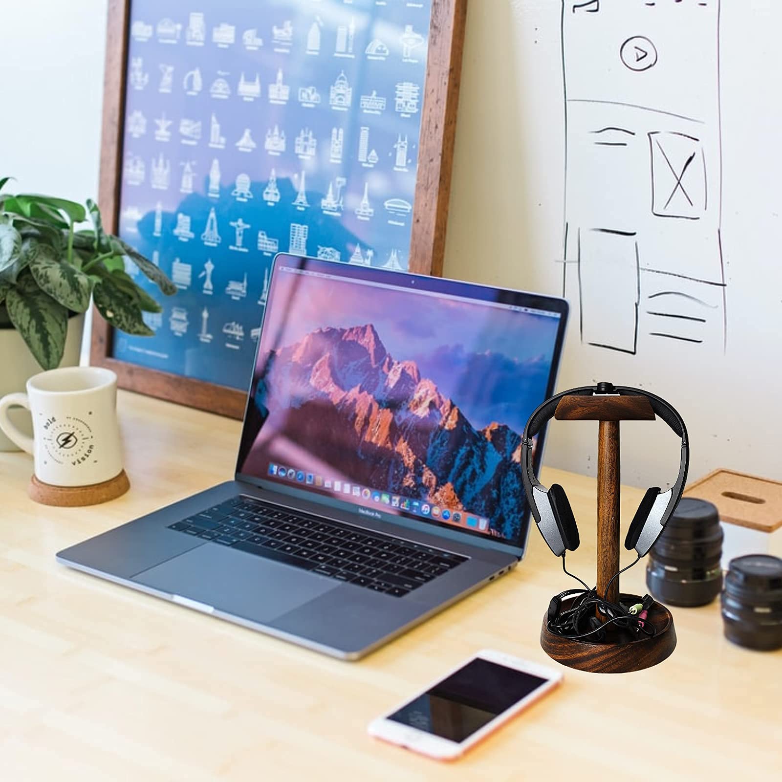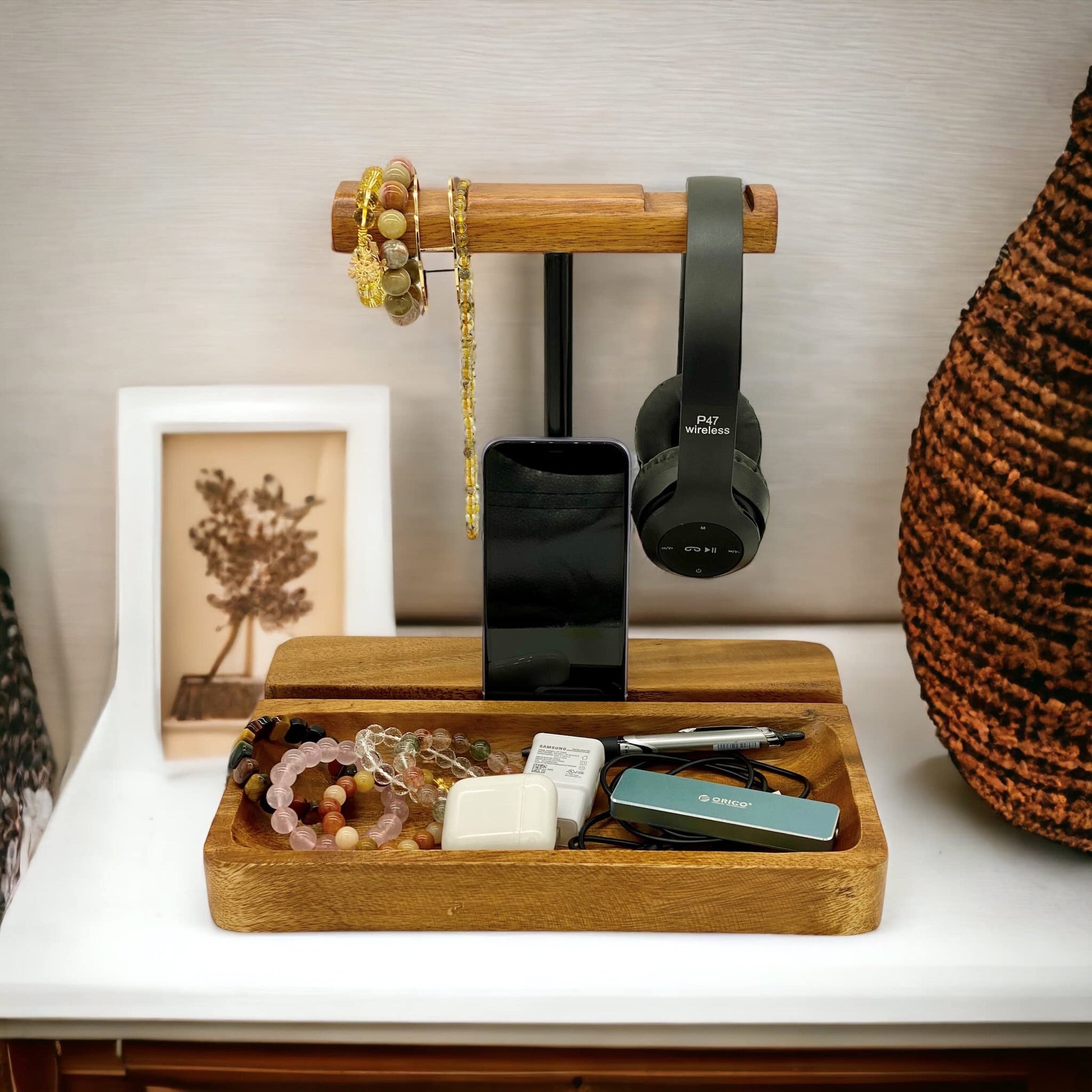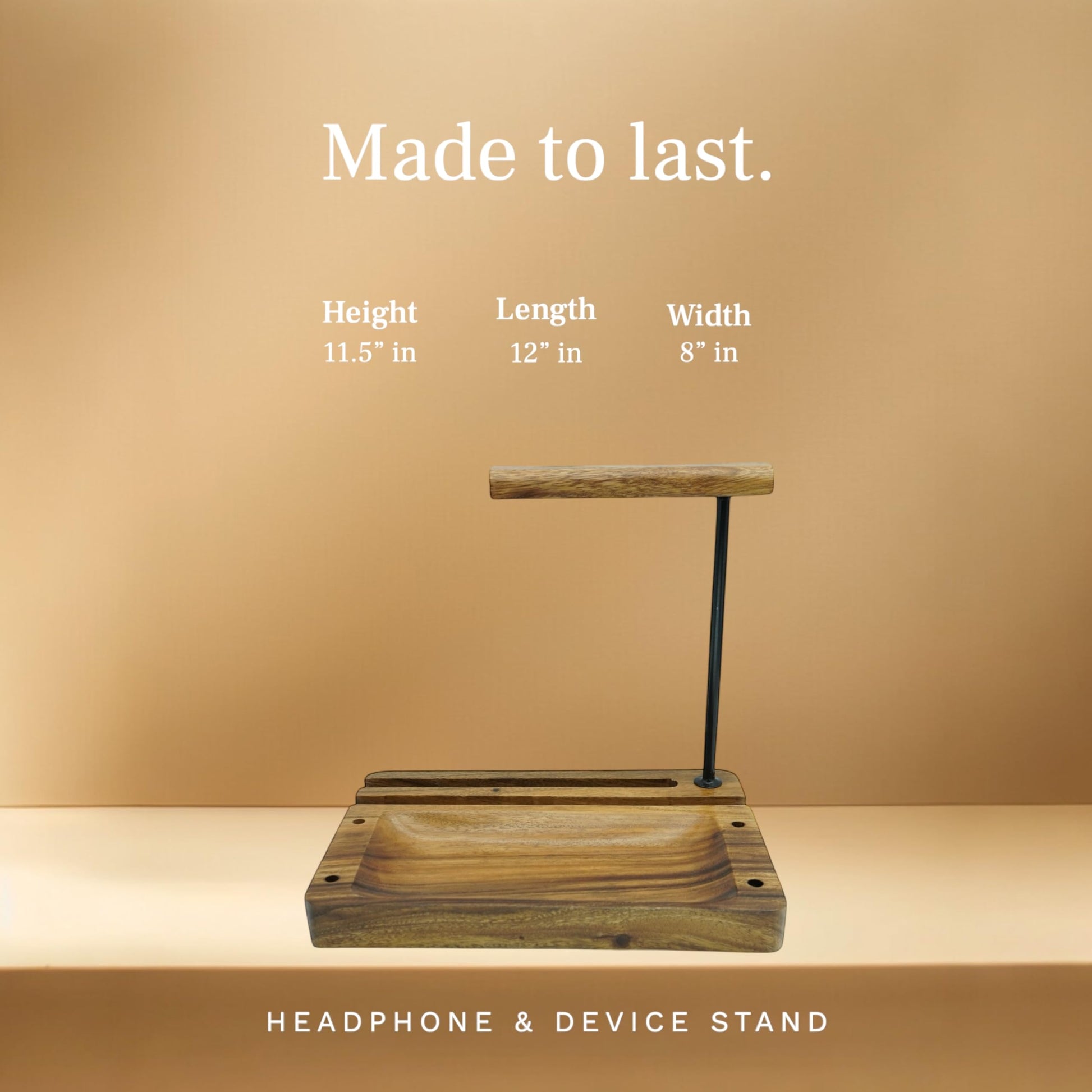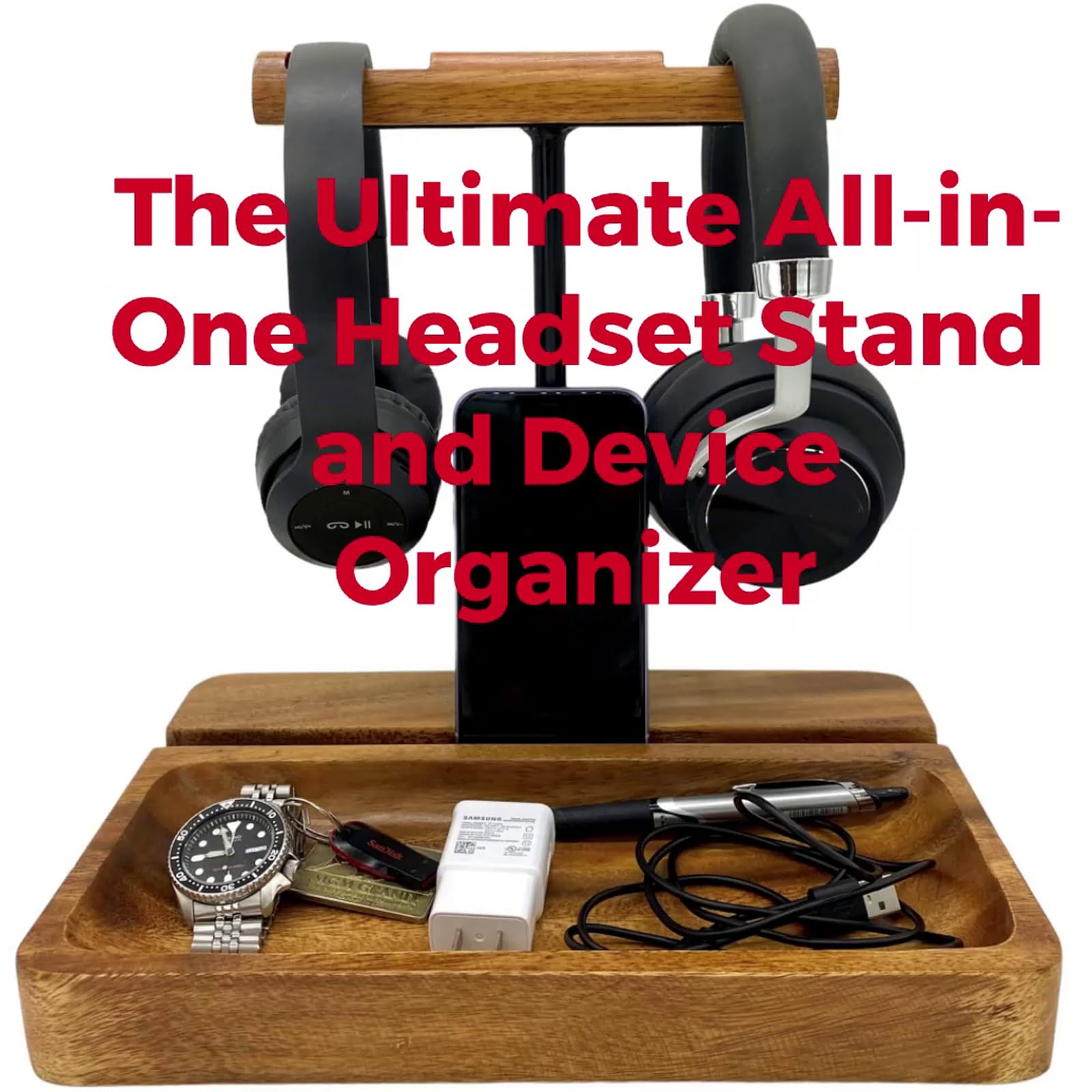 - Integrated Device Holder: Our wooden headphone stand features an integrated holder for cell phones and headsets, making it a versatile piece. This stand is perfect for holding your mobile phones and other devices while you work or play.